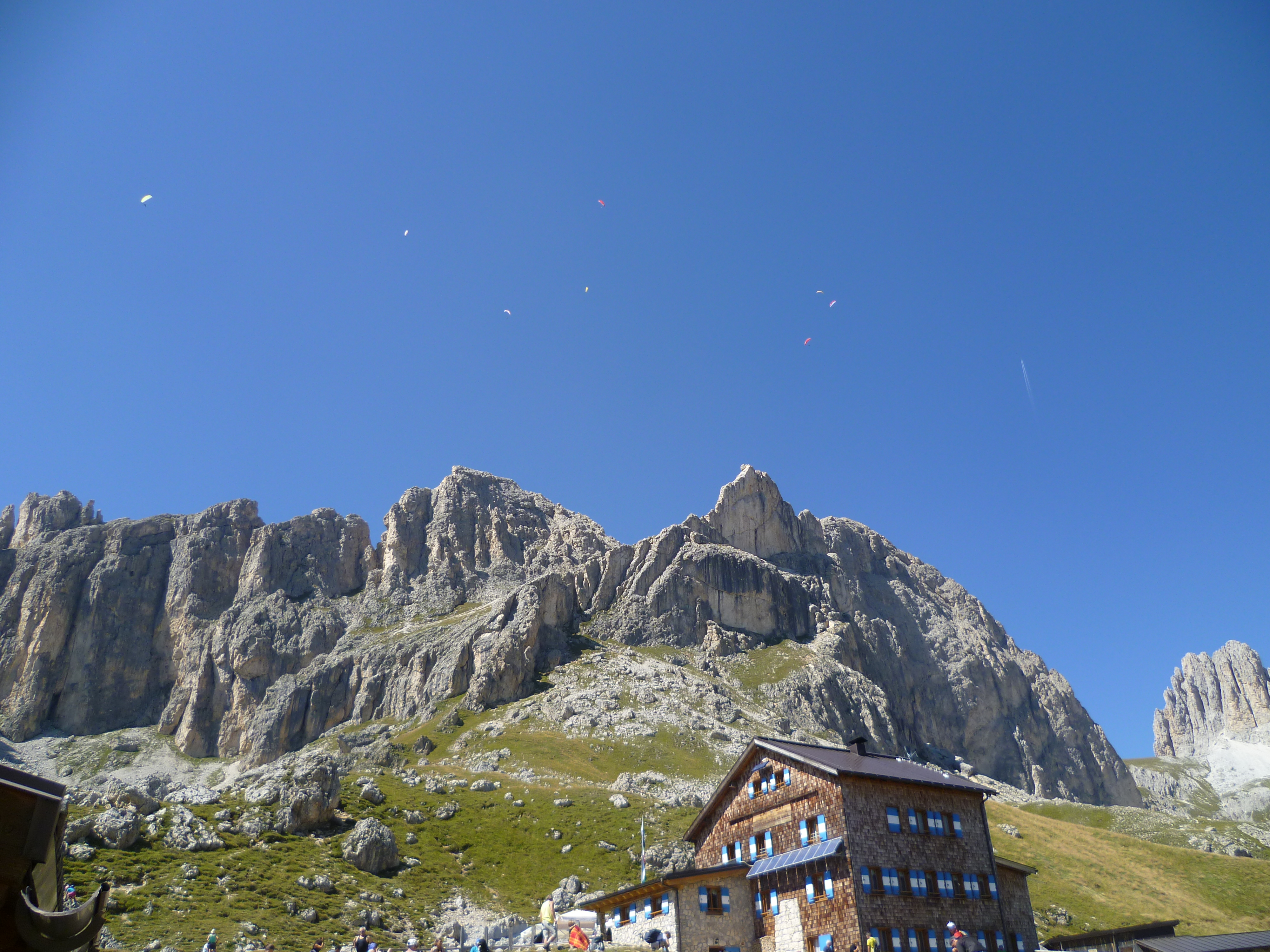 Da der Rosengarten nun schon mal quasi direkt vor der Haustür lag, musste dieser natürlich auch umwandert werden. Mit der Gondel und dem Sessellift ging es hinauf zur Kölner Hütte auf 2.337 Metern Höhe. Direkt hinter der Hütte geht es dann auch schon los auf einem recht steilen Steig (auch ohne Ausrüstung gut machbar) hinauf zum Tschagerjoch auf 2.635 Metern. Oben angekommen, genießt man dann einen umwerfenden Panoramablick ins Vajolettal. Weiter geht es nun erst ein Stück hinab, dann wieder hinauf, mal gemächlicher, mal steiler, und schließlich erreicht man den zweiten Pass, dem Cigolade Pass auf 2.552 Metern Höhe. Nach diesem ist die Rotwandhütte schon in Sichtweite. Die Pederiva Hütte in unmittelbarer Nähe zur Rotwandhütte eignet sich bestens für eine Verschnaufspause mit Speck Brettl oder Kaiserschmarrn und bietet zudem noch einen herrlichen Blick auf die umliegende Bergwelt.