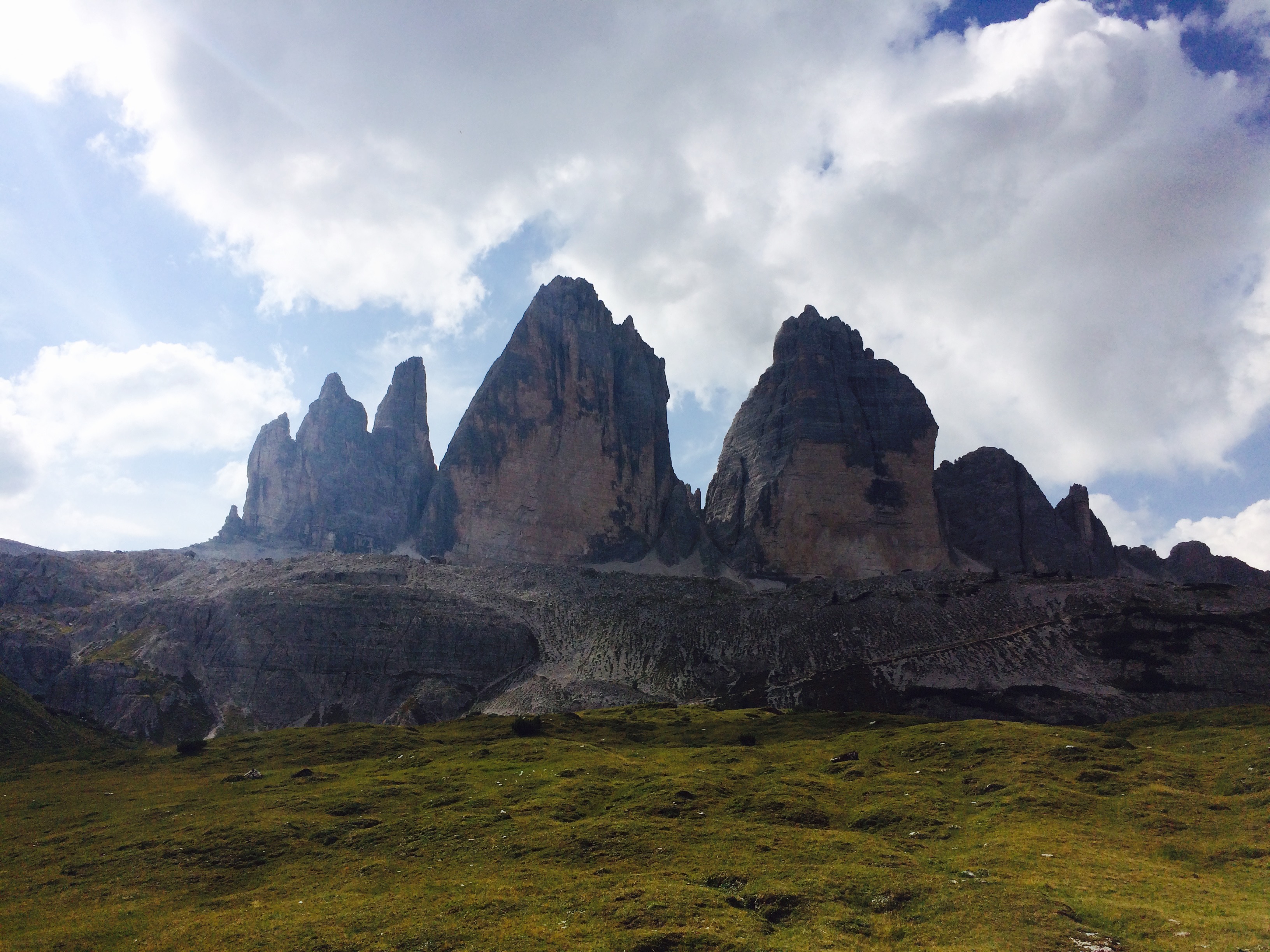 Je mehr Höhenmeter man macht (etwa 1.000 insgesamt) umso anstrengender wird die Tour, doch nach circa 3,5 Stunden hat man es dann geschafft und kann sich gar nicht sattsehen, an diesen 3 Gipfeln, die, wenn man es genau nimmt, eigentlich 5 sind. Hier oben an der 3 Zinnen Hütte, merkt man dann auch zum ersten Mal, dass man nicht alleine ist. Nachdem man auf der Wanderung stundenlang alleine gewandert ist (viele beginnen ihre Tour im Fischleintal oder fahren gleich mit dem Auto bis fast nach oben) geht es an der 3 Zinnen Hütte deutlich trubeliger zu. Trübt ein bisschen die Idylle, ist aber zu verkraften.
