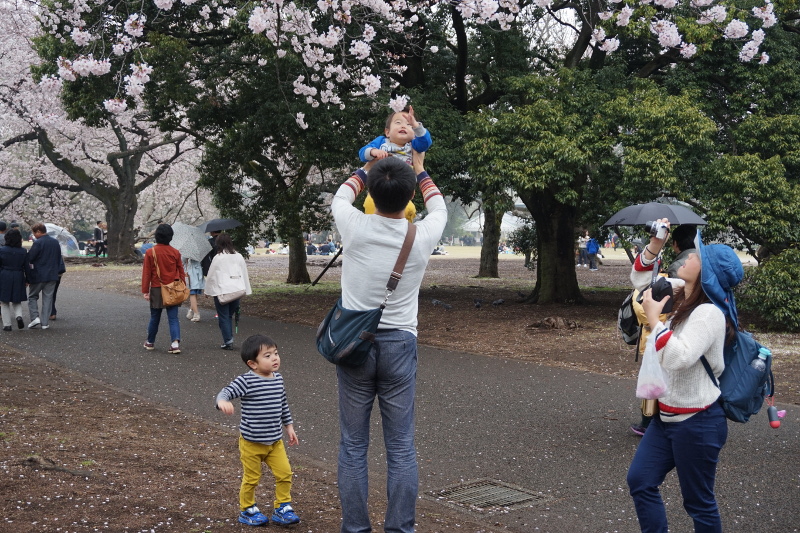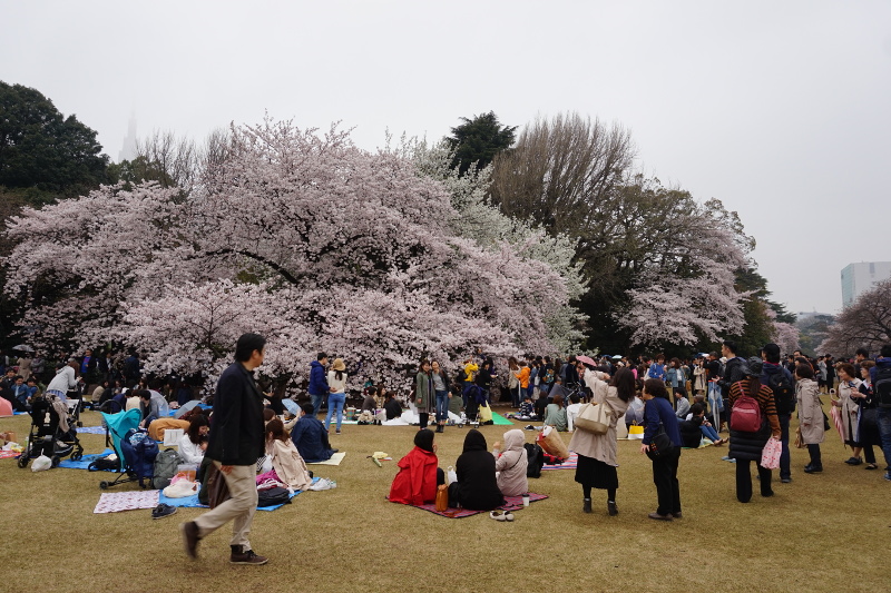 Tausende von Tokiotern/Japanern (Plus eine Handvoll Touristen) genossen den Nachmittag im Park, machten unzählige Fotos/Selfies vor den Kirschbäumen – und das alles bei Nieselregen. Das Hanami, die Feier der Kirschblüte (Sakura), ist bei Jung und Alt sehr beliebt, man trifft sich am Wochenende oder unter der Woche nach Feierabend, isst zusammen, trinkt zusammen und läutet so quasi den Frühling ein. Das Wetter ist dabei zweitrangig, die Kirschblüte geht vor.