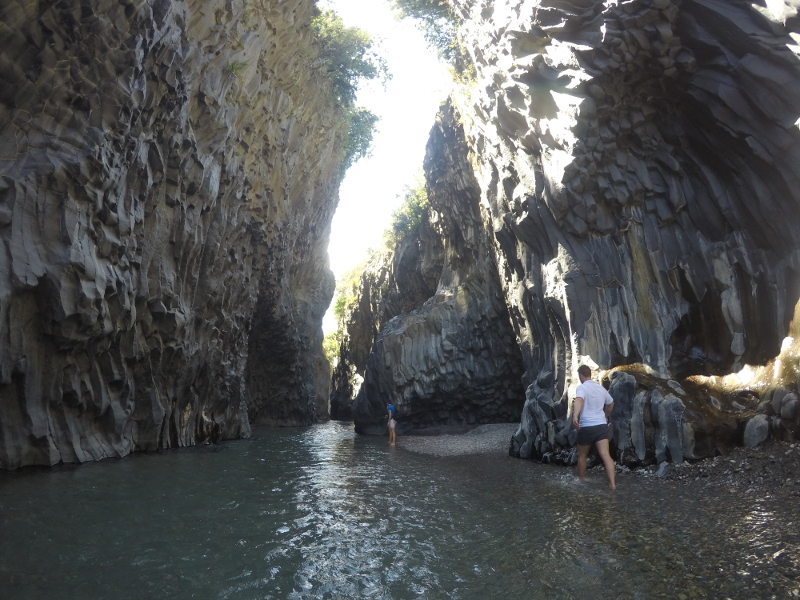 Fünfter Stopp: Die Alcantara Schlucht. Auslöser war vor vielen Tausend Jahren ein Erdbeben, durch das ein großes Basalt-Feld, Überbleibsel eines Vulkanausbruchs, in zwei Teile brach. Der Alcantara Fluss nutzte die entstandenen Risse und formte die heutige Schlucht mit ihren markanten, glatt geschliffenen Orgelpfeifensäulen. Mit einem Guide sind wir die Schlucht etwas entlanggewandert, haben viel Interessantes erfahren und die wirklich schöne Gegend genossen.