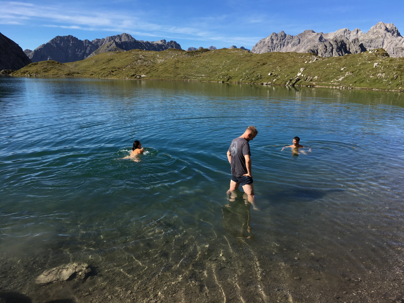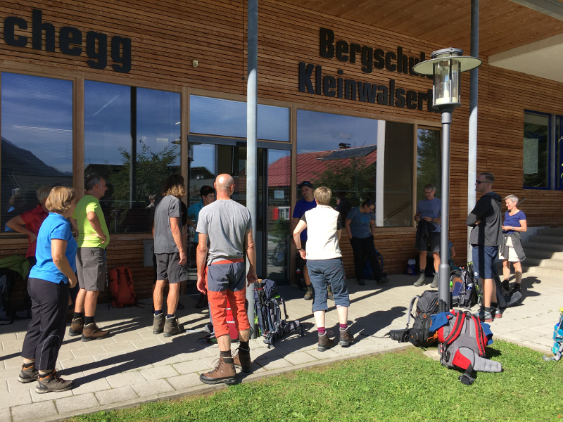 Nein, so mutig war ich nicht, gefühlte 5 Grad Wassertemperatur waren mir doch zu kaltTreffpunkt für mich und meine Mitwanderer war ein sonnig warmer Sonntag im September vor der Bergschule in Mittelberg. Wir beäugten uns zunächst noch alle etwas misstrauisch, schließlich würden wir die nächsten 7 Tage von morgens bis abends einander ausgeliefert sein. Unser Wanderführer Andreas lockerte gekonnt die Stimmung auf, indem er sich im Schnelldurchlauf alle 22 Namen zu merken versuchte, was nur so bedingt funktioniert hat 🙂