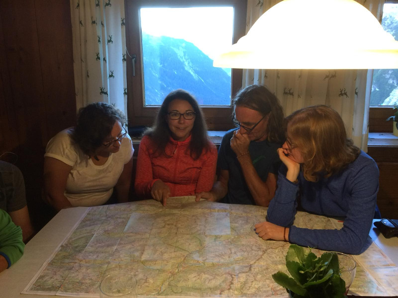 Das gehörte ebenfalls zum abendlichen Pflichtprogramm: die Wanderroute auf der Karte zu rekonstruierenDie Wandergruppe