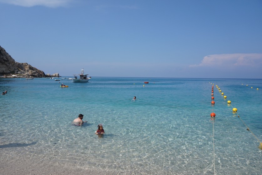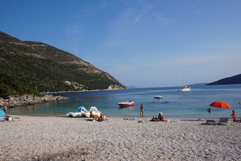 Grundsätzlich muss noch erwähnt werden, dass all diese Traumstrände Kiesstrände sind, mit mal mehr (Porto Katsiki) mal weniger (Mylos und Strand von Agios Nikítas) spitzen Steinen. Beim nächsten Urlaub würde ich auf jeden Fall das Geld für Badeschuhe ausgeben, denn auch wenn man bei jedem Gang ins Wasser eine Fußreflexzonenmassage gratis dazu bekommt, tut es einfach weh.
