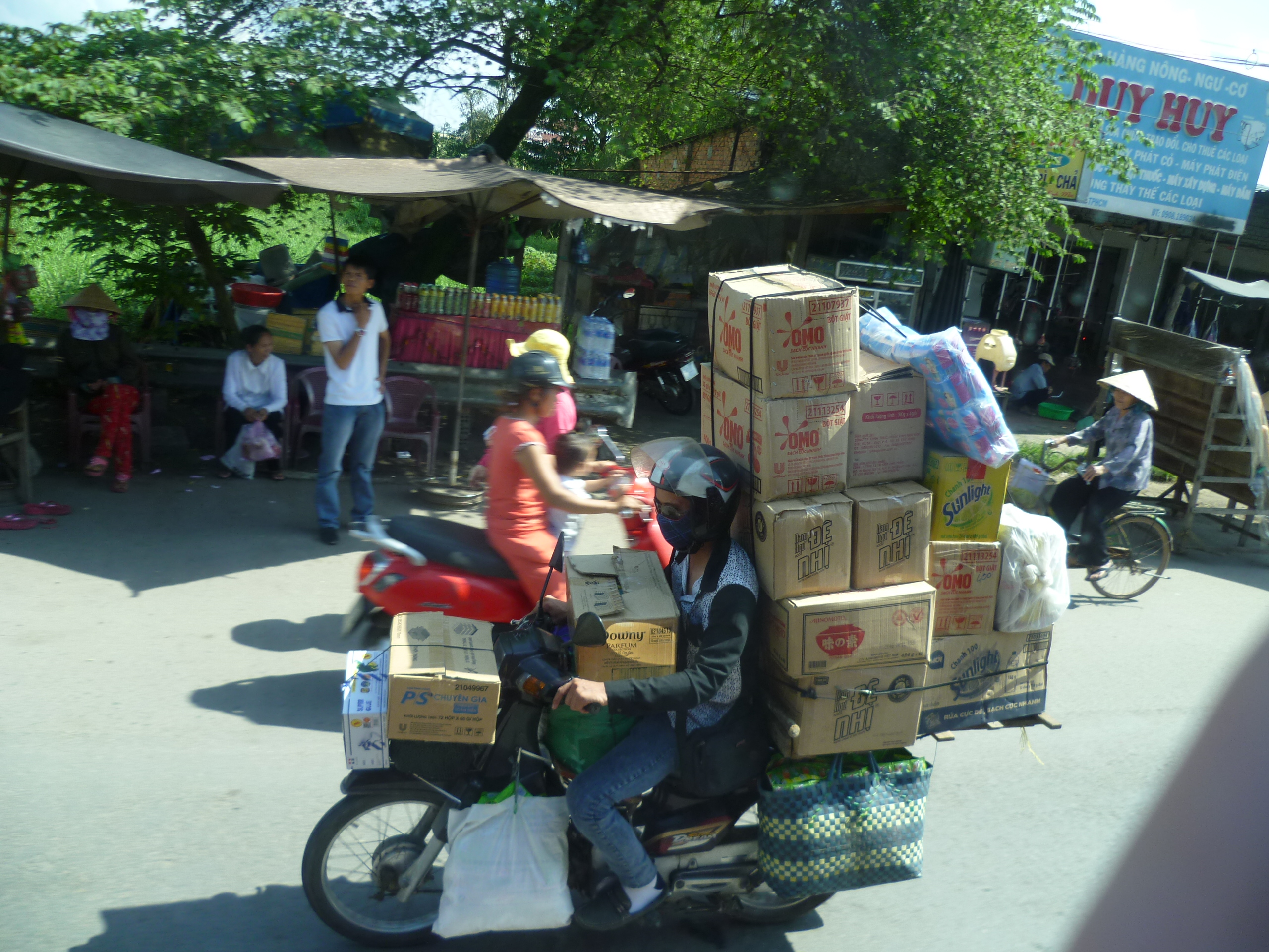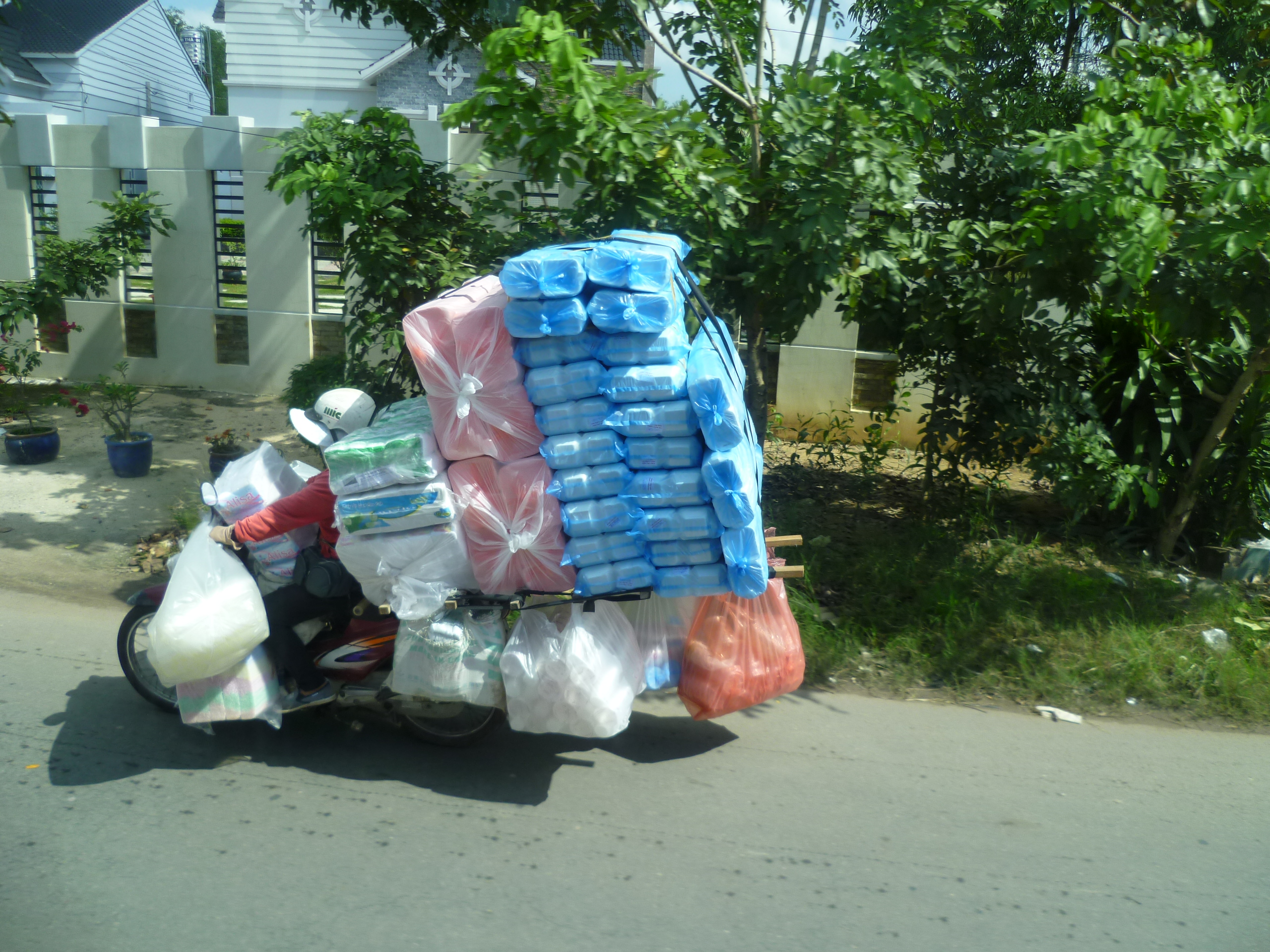 Heute morgen hieß es wieder früh aufstehen, denn es ging mit dem Bus nach Phnom Penh. Die Tatsache, dass die Fahrt 7 Stunden dauern würde, hatte mich zunächst nicht sonderlich begeistert – letztendlich habe ich mich jedoch keine Minute lang gelangweilt. Denn es gibt so viel zu kucken: Vor unzähligen kleinen Lädchen wird gekocht, gegessen, verhandelt und gespielt – und zwischendrinn grast auch mal ein Pferd. Und dann diese Massen an Mopeds, die sich scheinbar auch noch durch die kleinste Lücke schlängeln können und eine Menge an Sachen transportieren, für die man in Deutschland einen Laster bräuchte. Hier drei besonders schöne Beispiele:
